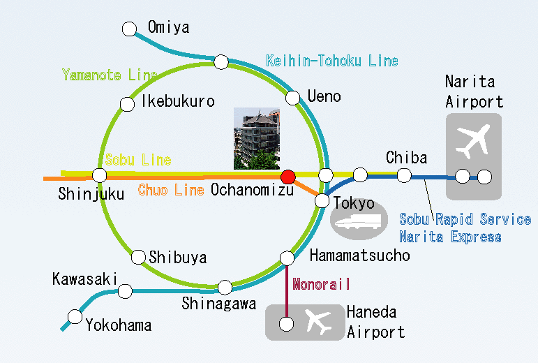 | If coming by taxi, it is better to instruct the driver to go to "Yamano-ue Hotel" (Hill-top Hotel) instead of "Kagaku-Kaikan"(Chemistry Hall), since it is a well known landmark among taxi drivers and is less than a 1 minute walk to the Chemistry Hall. In the map the Chemistry Hall is shown by blue marks and "Yamano-ue Hotel" is shown by purple marks. Train or Subway | ||