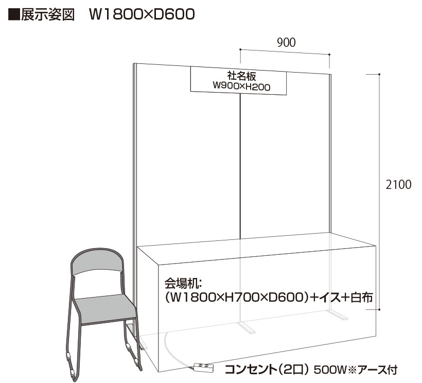 - バックパネル2枚、机1本、椅子1脚、社名版、白布、画鋲、電源(500 W、アース付き