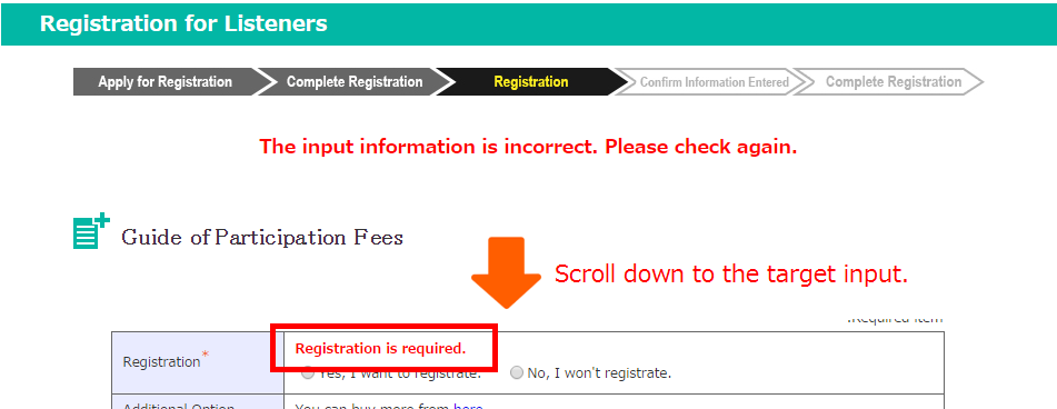 If you have more than one error, an message -The input information is incorrect.- will appear on the top of page. To get the detail information about errors, scroll down to the target input and check red error message.